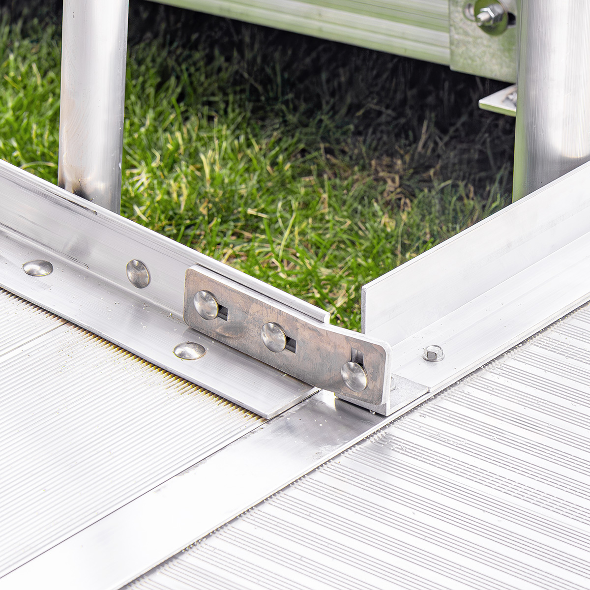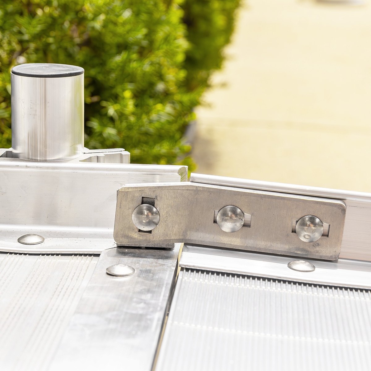 An adapter pack includes all necessary hardware to attach Rampit USA ramps to platforms. These adapters are reversible and can be used for ramps that go up or down.